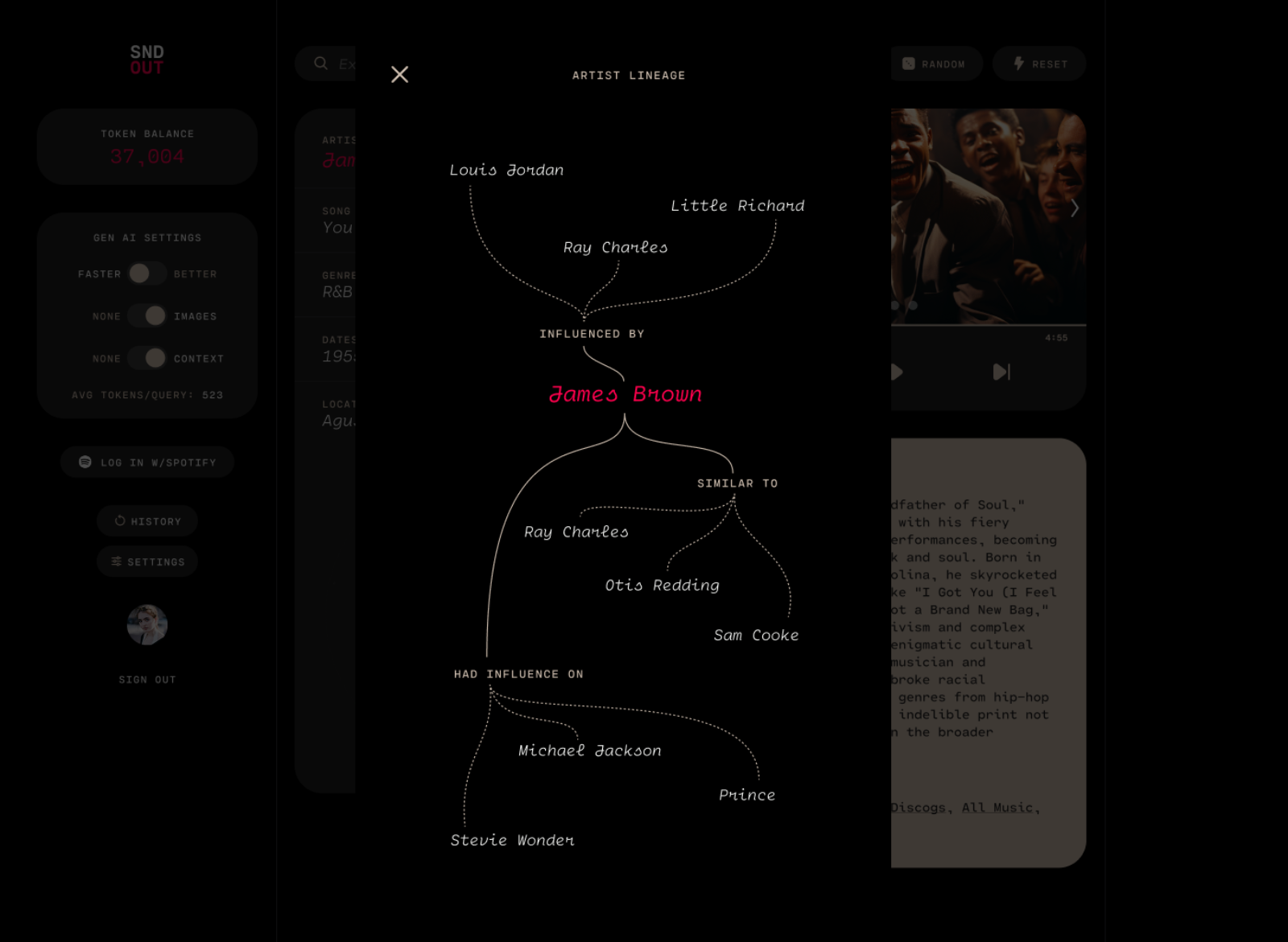 This idea of relationship mapping and lineage has been a continuous theme in many projects over the years. Twenty years after that backpacking epiphany, AI finally gave me the tools to realize this vision. For my recent project SNDOUT, I revisited some of my early interest in mapping music lineage. This time using the embedded graph knowledge (connection vectors between entities) in AI models to represent a probabilistic view of the music lineage for bands and artists. For the first time I feel I have the tools to automate an idea that was always so daunting — mapping the lineage and connections between all things. It may be my favorite capability of generative AI.
