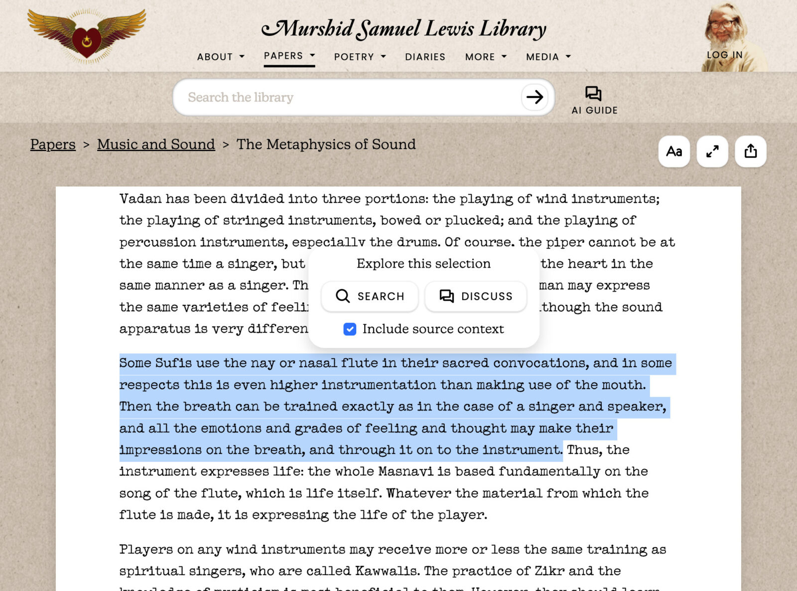 A mix of curiosity and a desire to understand the deeper meaning led me to build an AI "guide" to translate the words and phrases into something clear and understandable. I put all of Murshid Sam's writing into a vector store — using embeddings to capture semantic relationships between his concepts, allowing the AI to draw connections across his entire corpus that no human reader could hold in memory. I worked with the official archivist of his writing to refine the prompt and focus the tone and language to be authentic. We made a conscious decision not to anthropomorphize the guide — it's a stoic and helpful translator, nothing more.